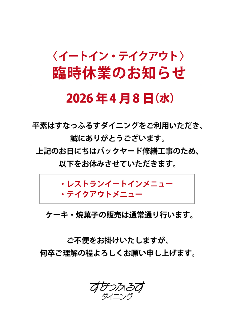 【2026年4月8日(水)】<イートイン・テイクアウト>臨時休業のお知らせ